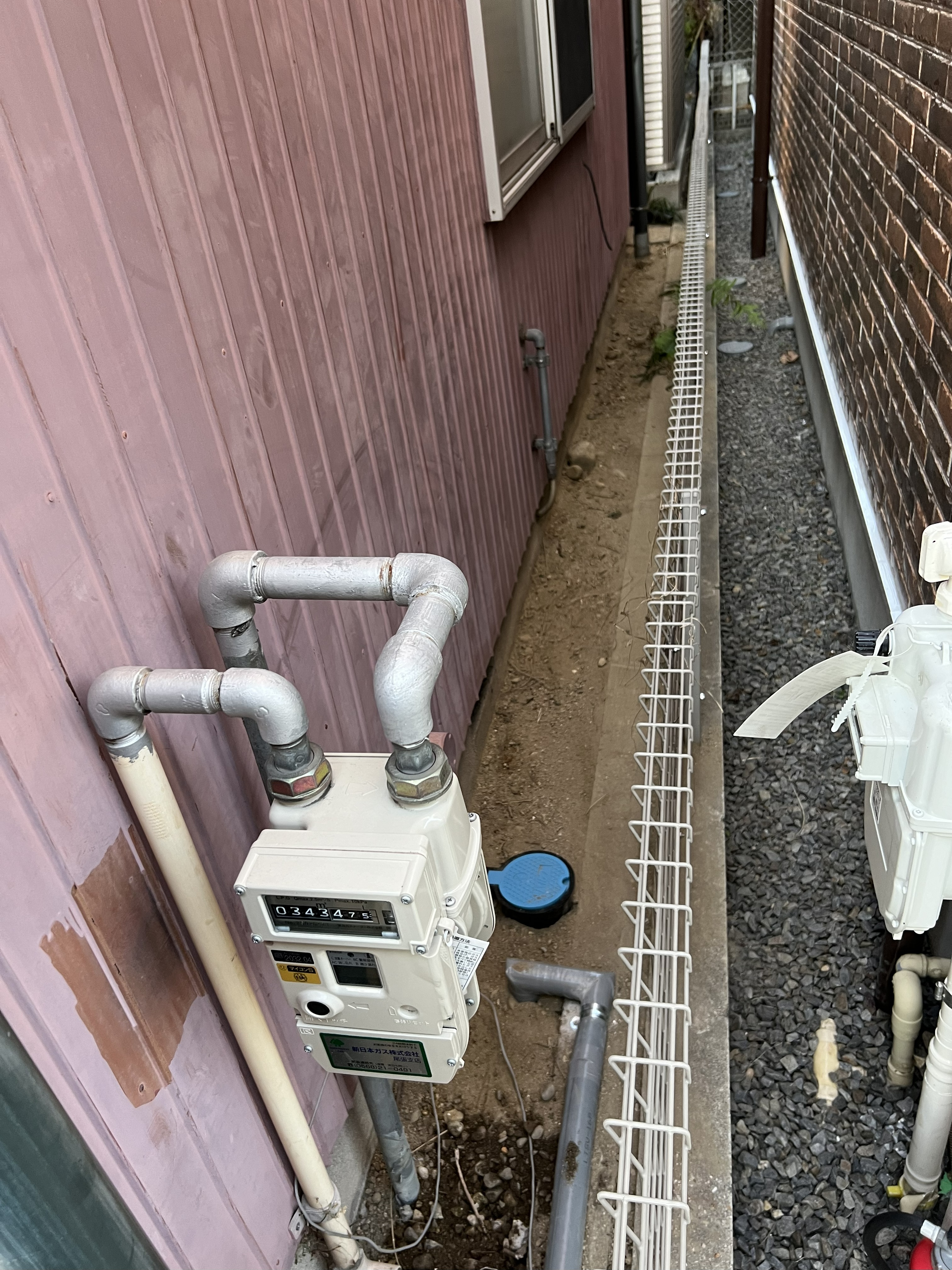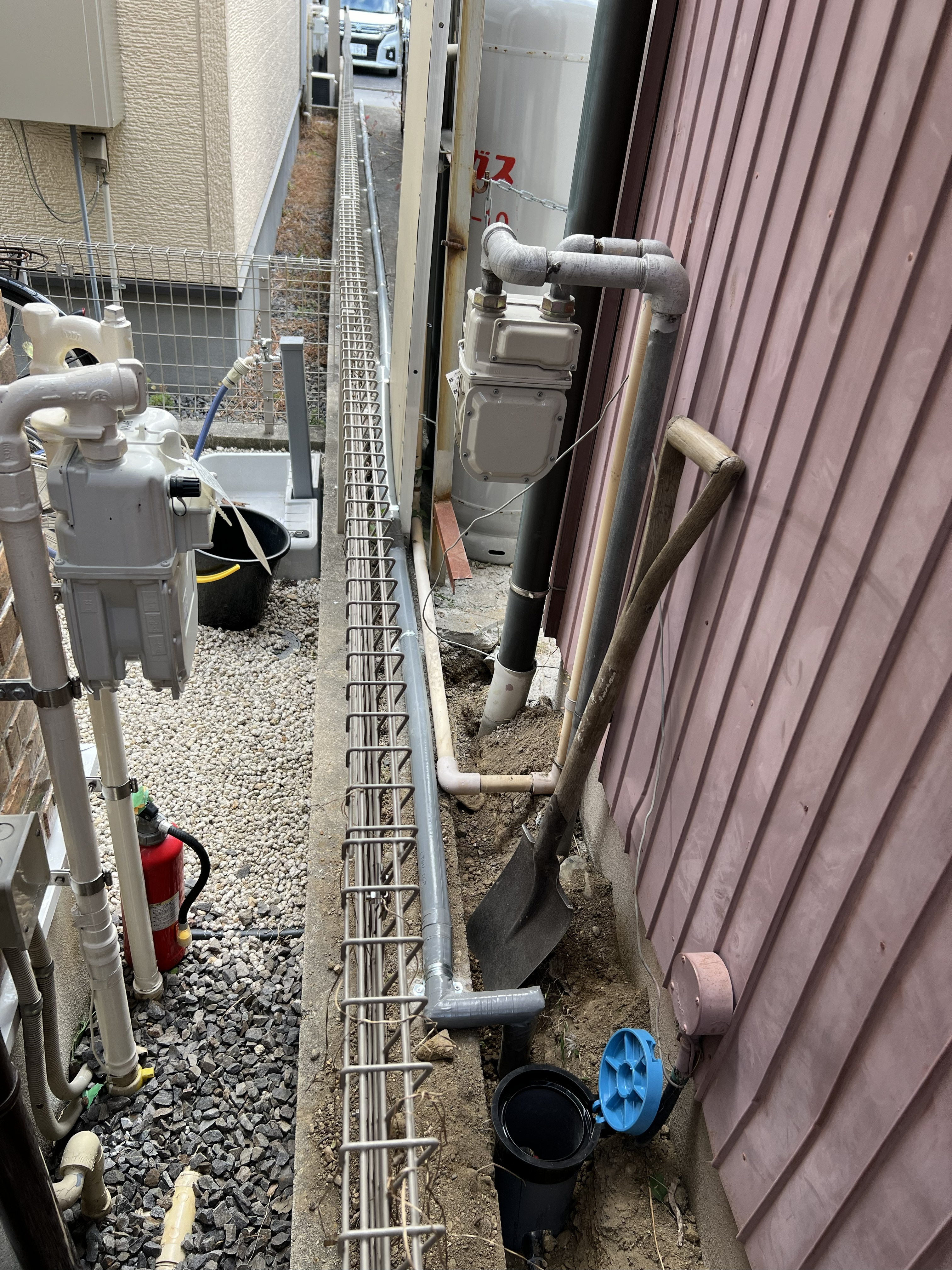 建物の側面の水道管も新しく設置していきました。水道管が露出する個所は保温材を