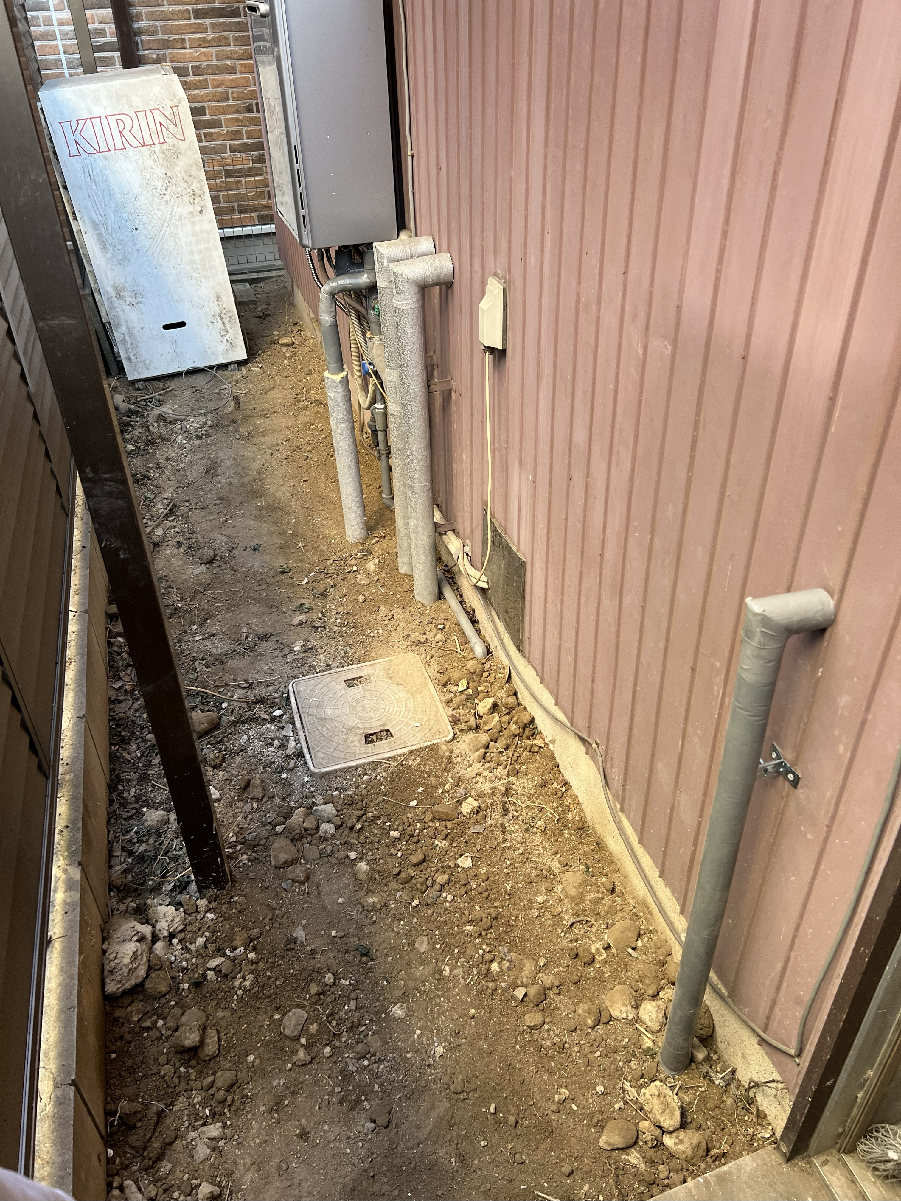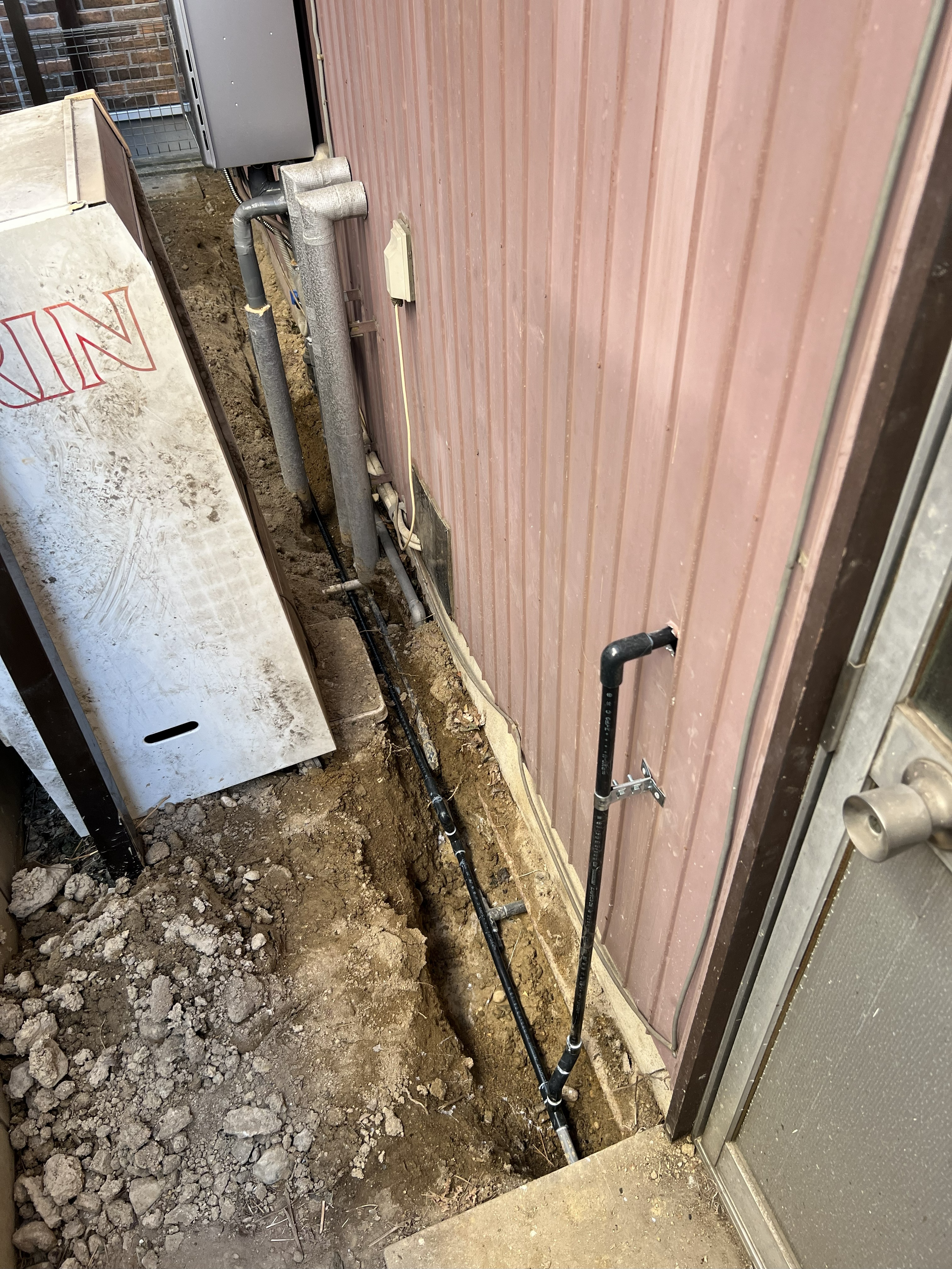 建物側の給水立管の保温材処理を行い土間の埋め戻し処理を行い水道管の引き
