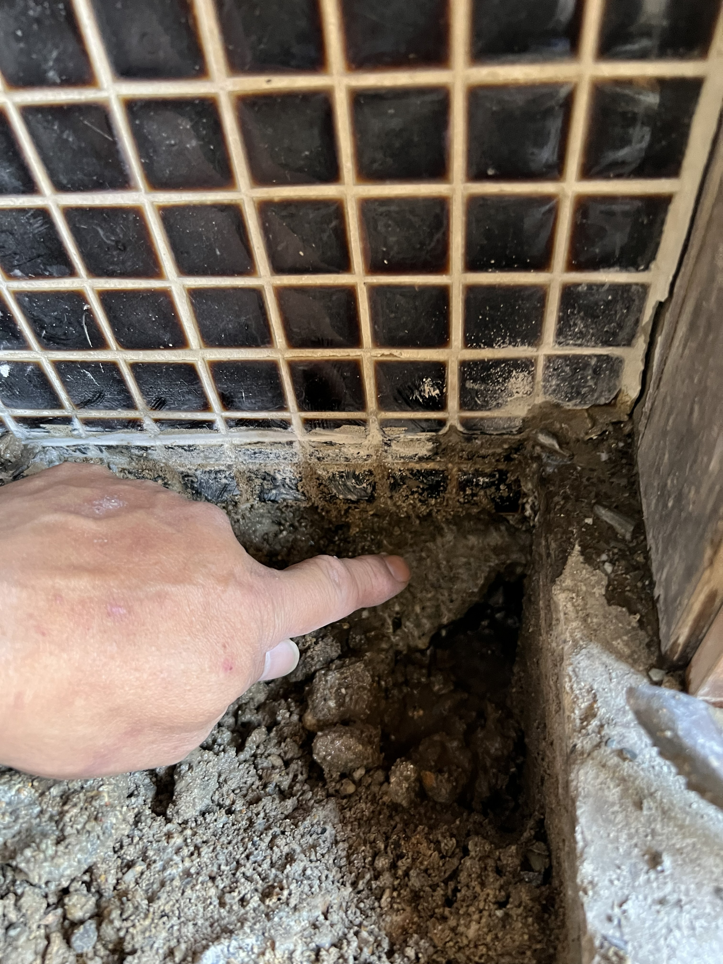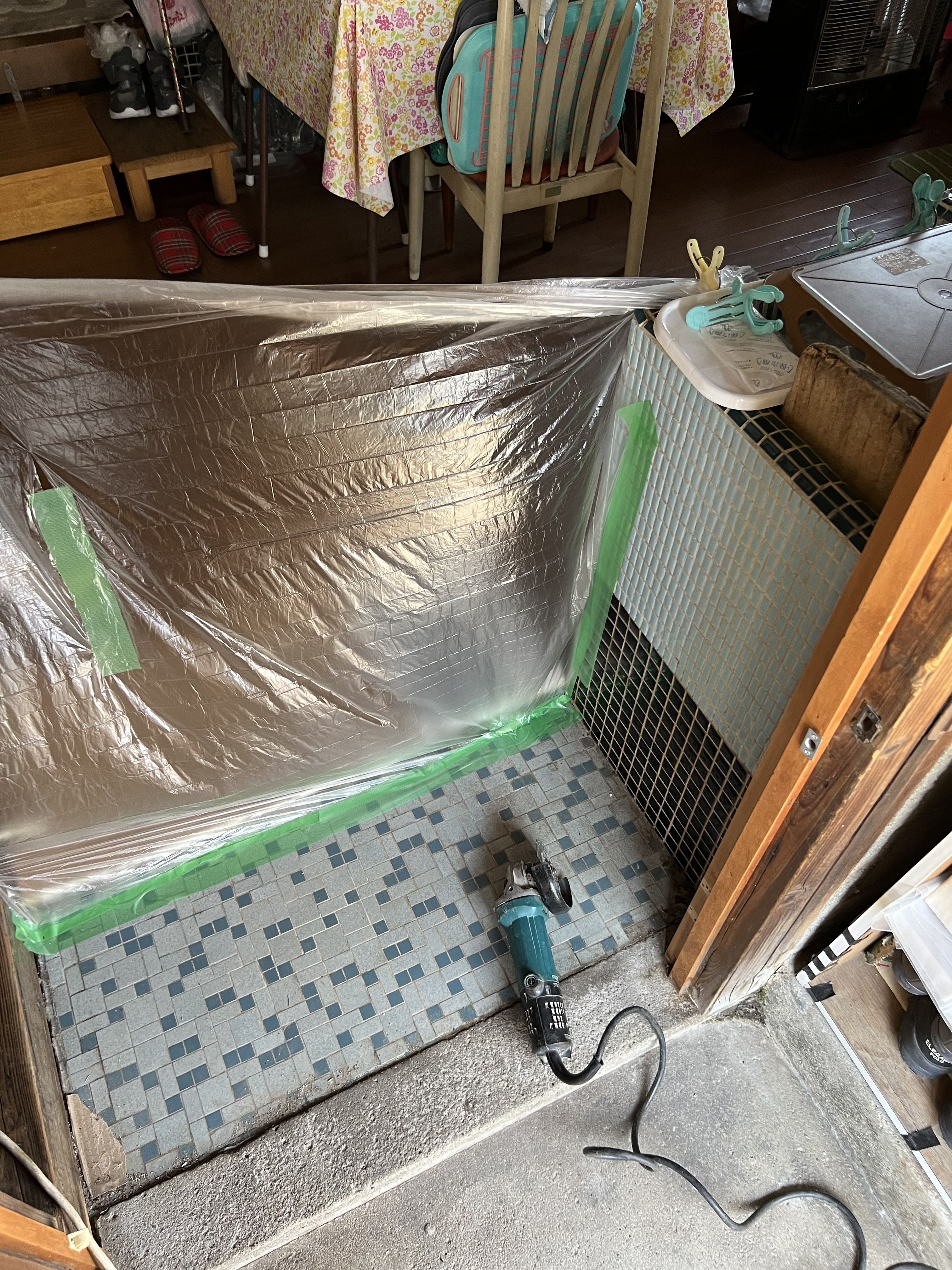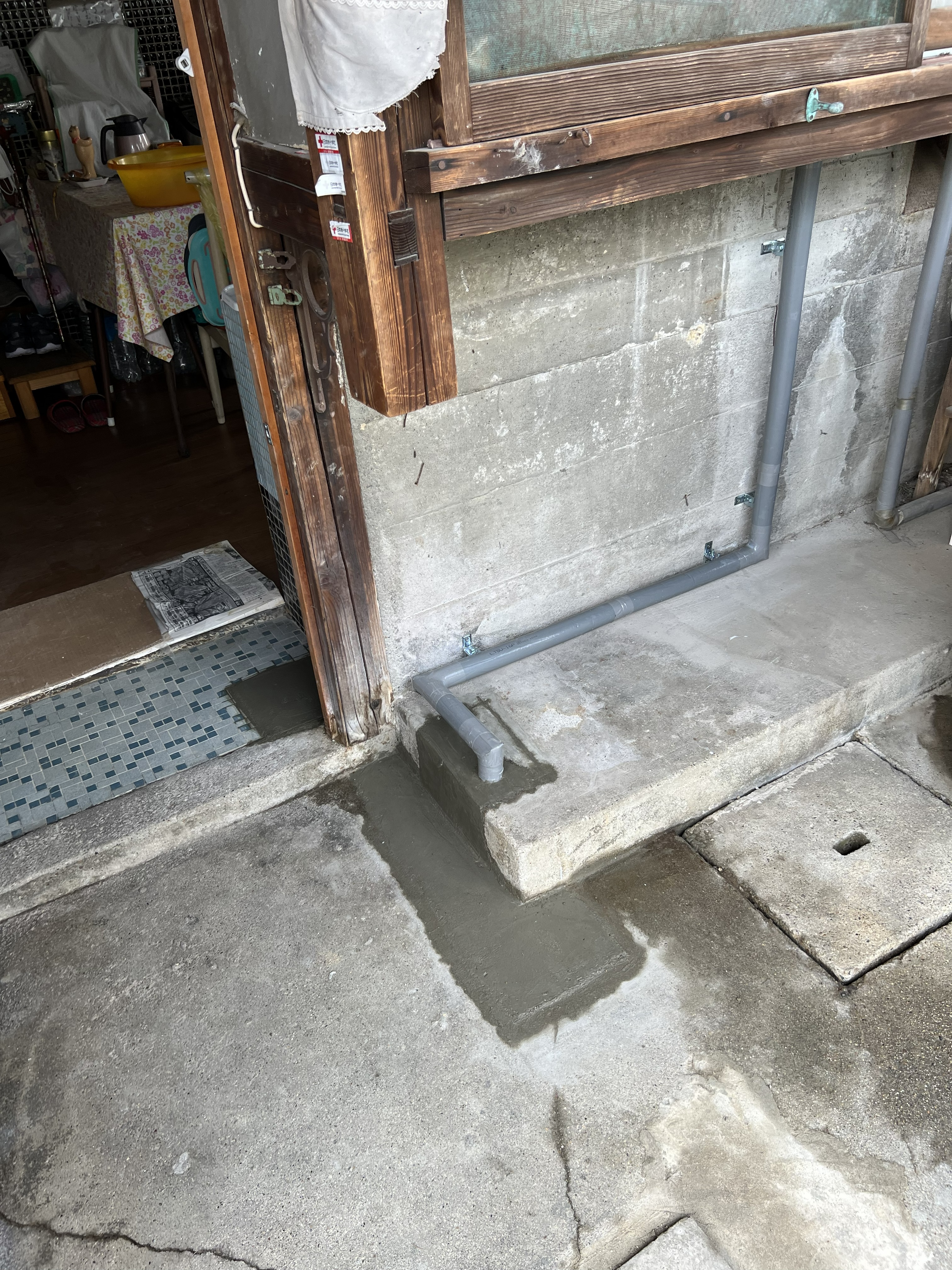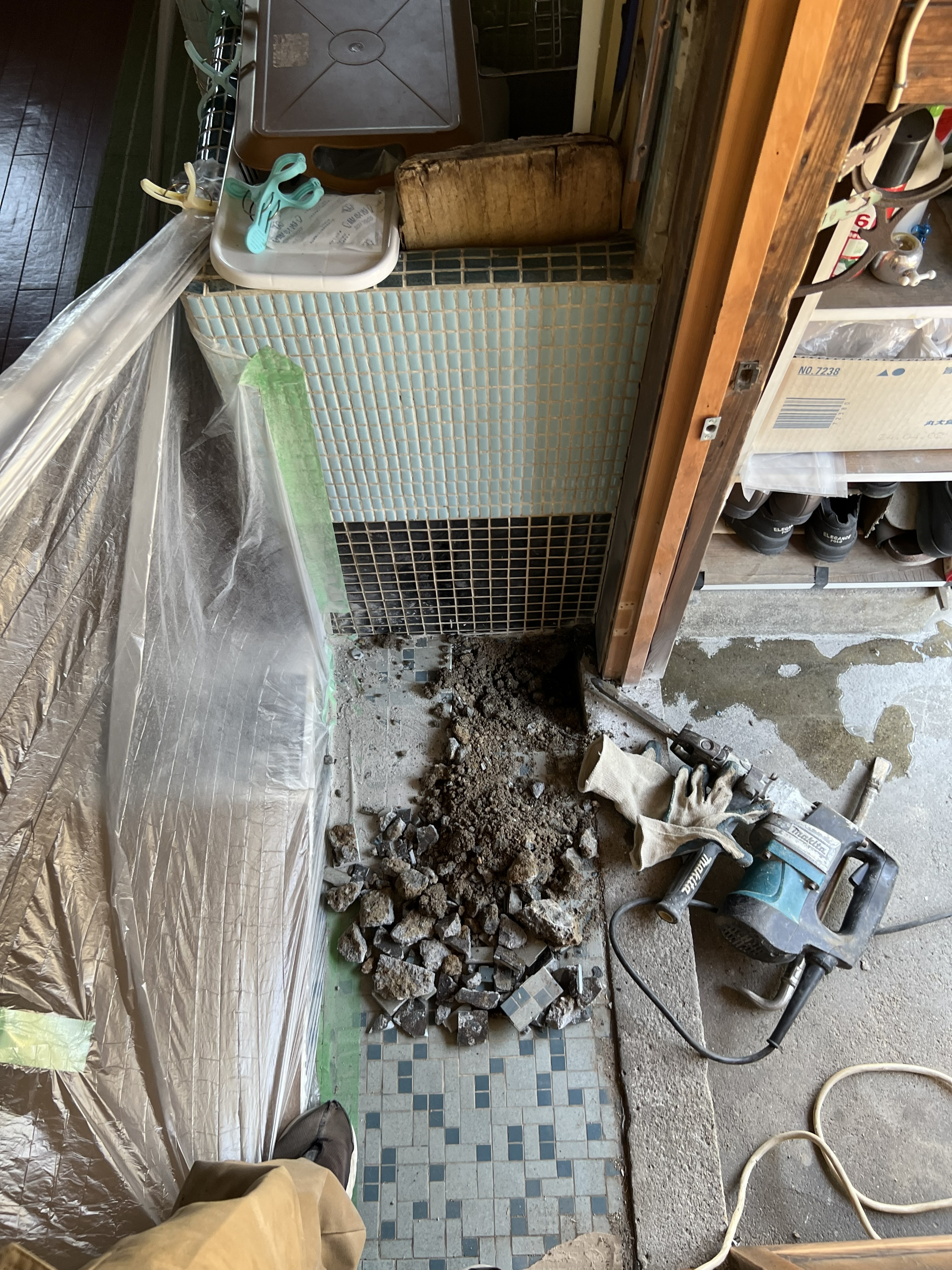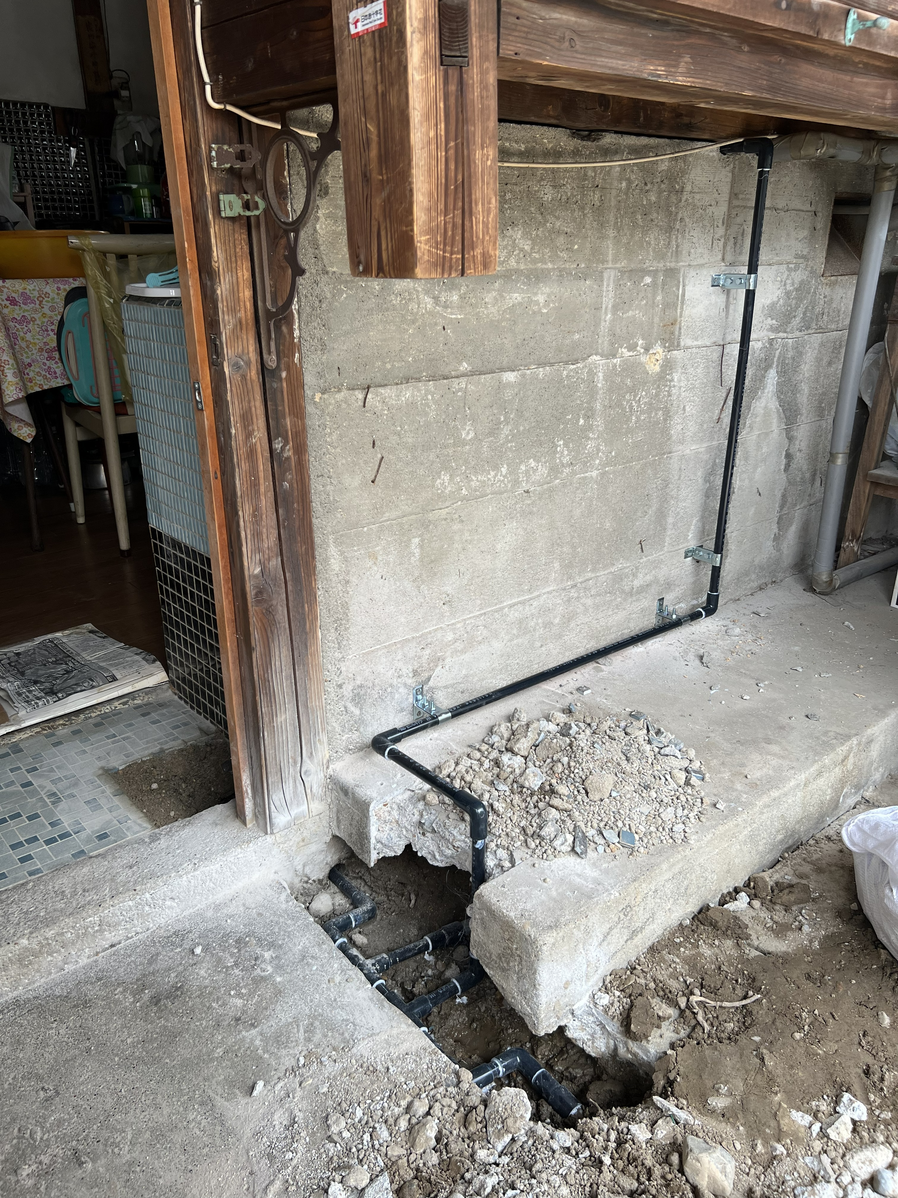 ⇦調査の結果、古いキッチンの勝手口の土間