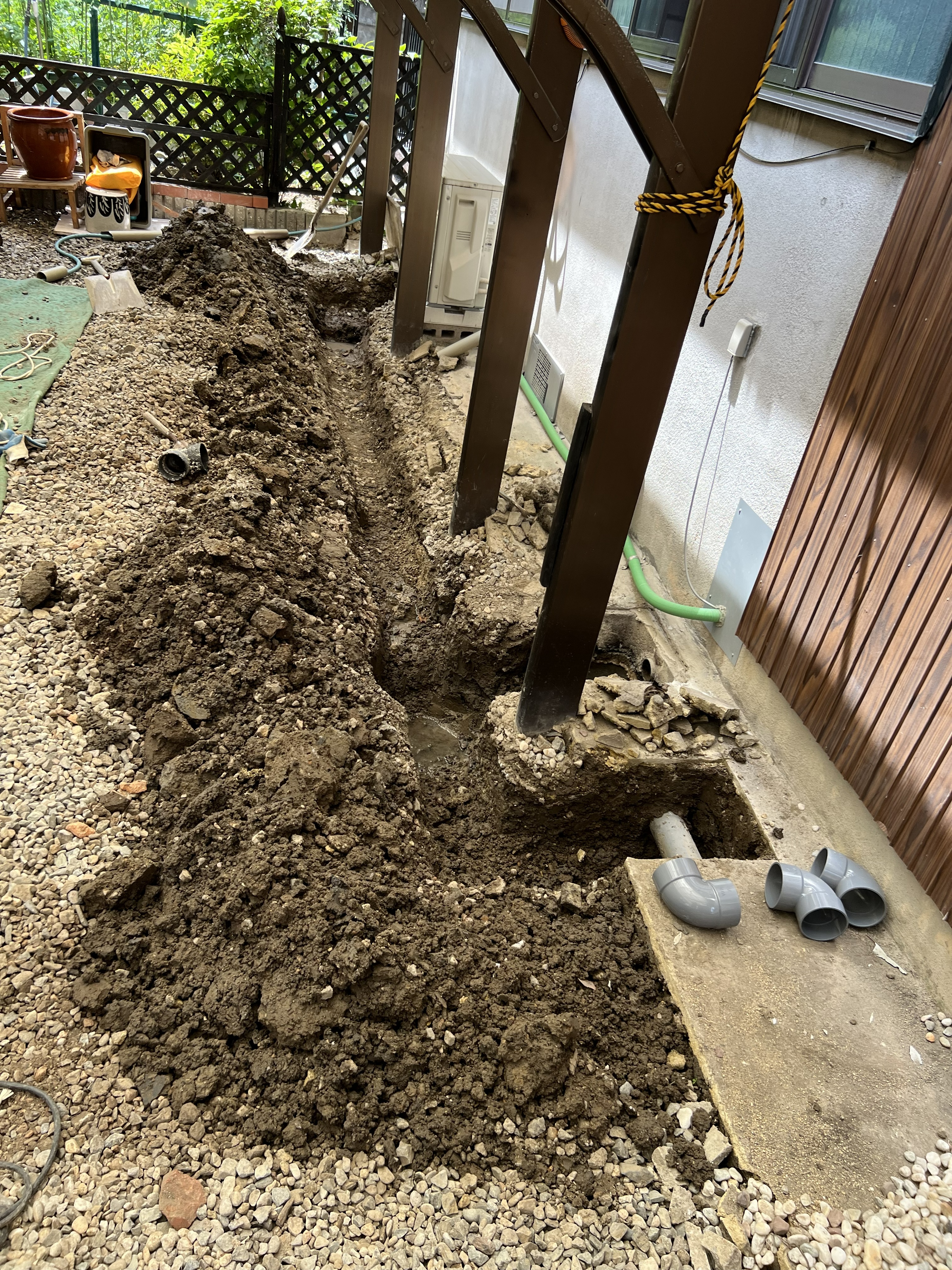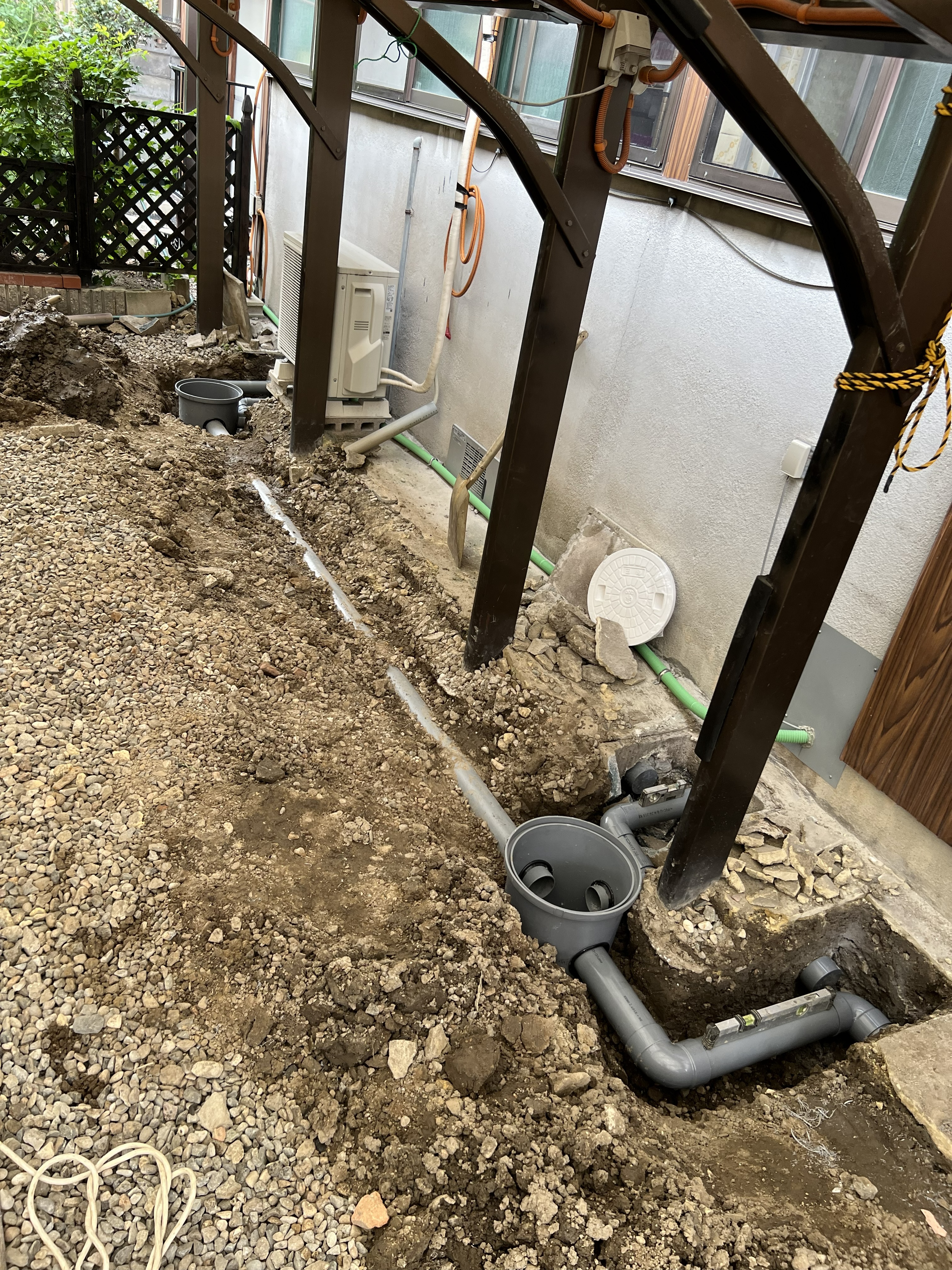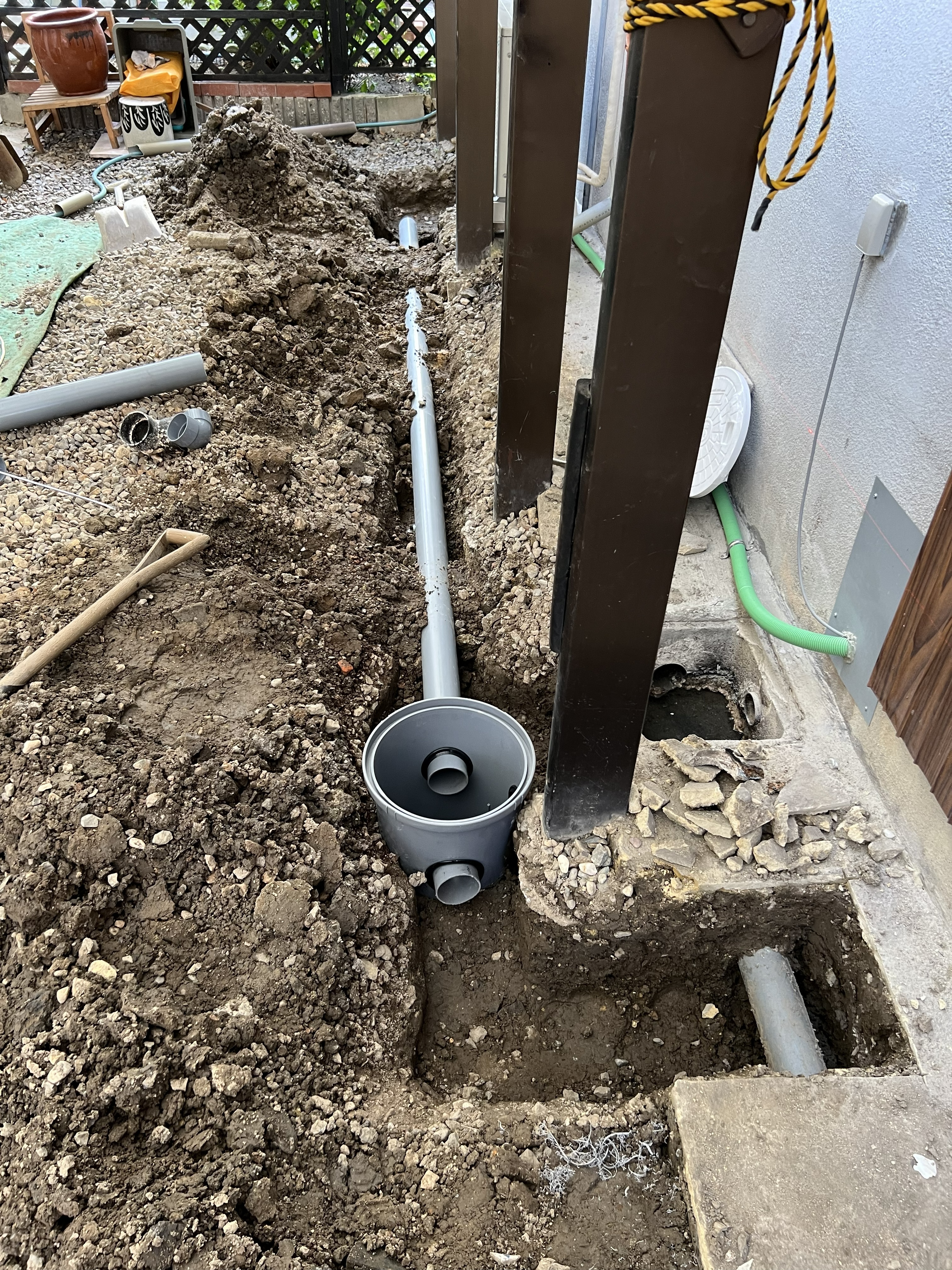 既設のコンクリートマスとは位置を変え排水マスと排水管を設置していきました。