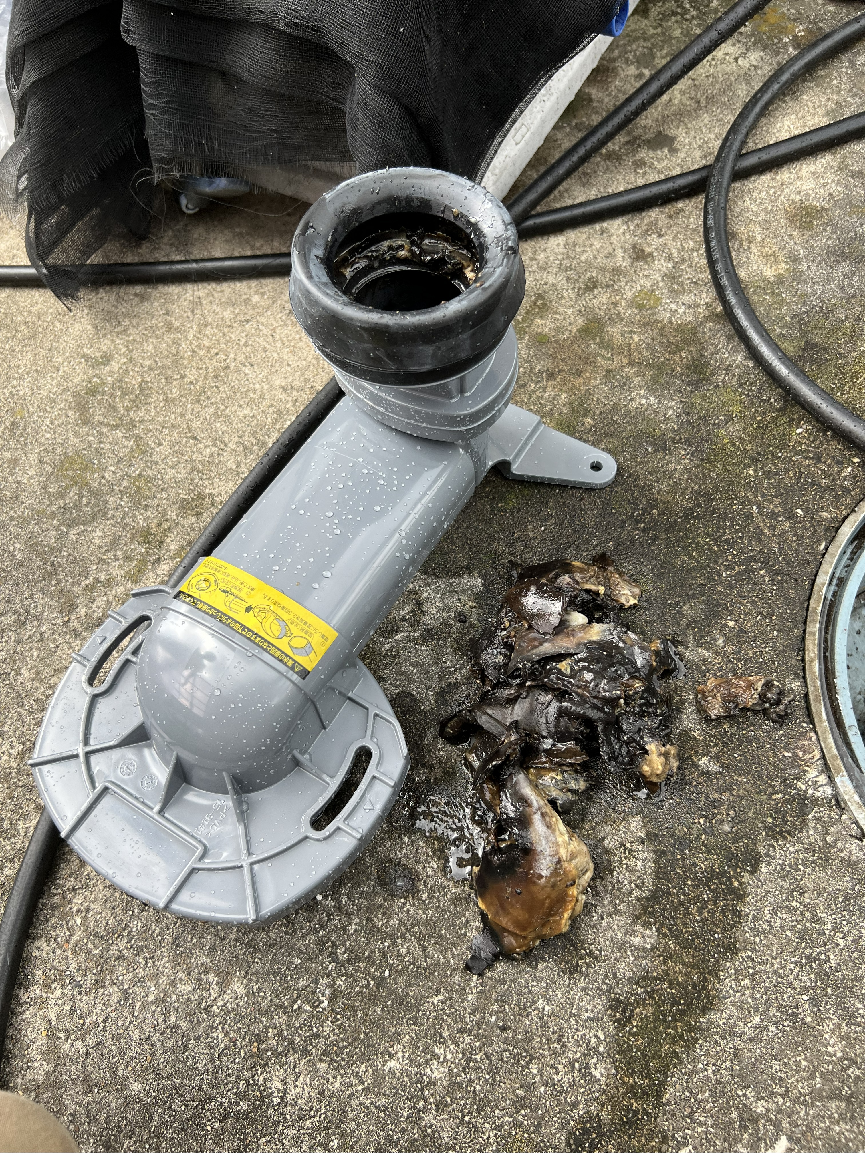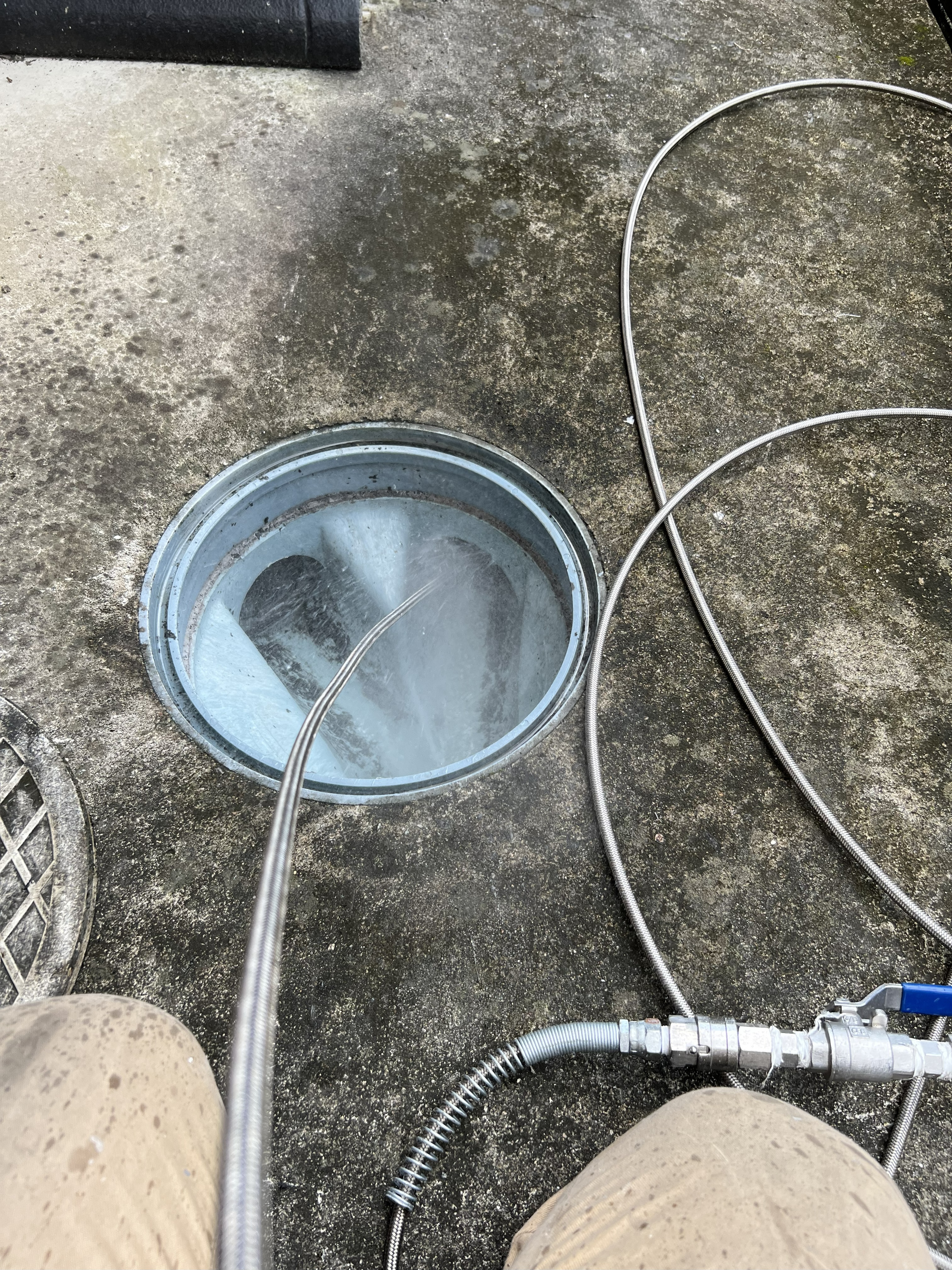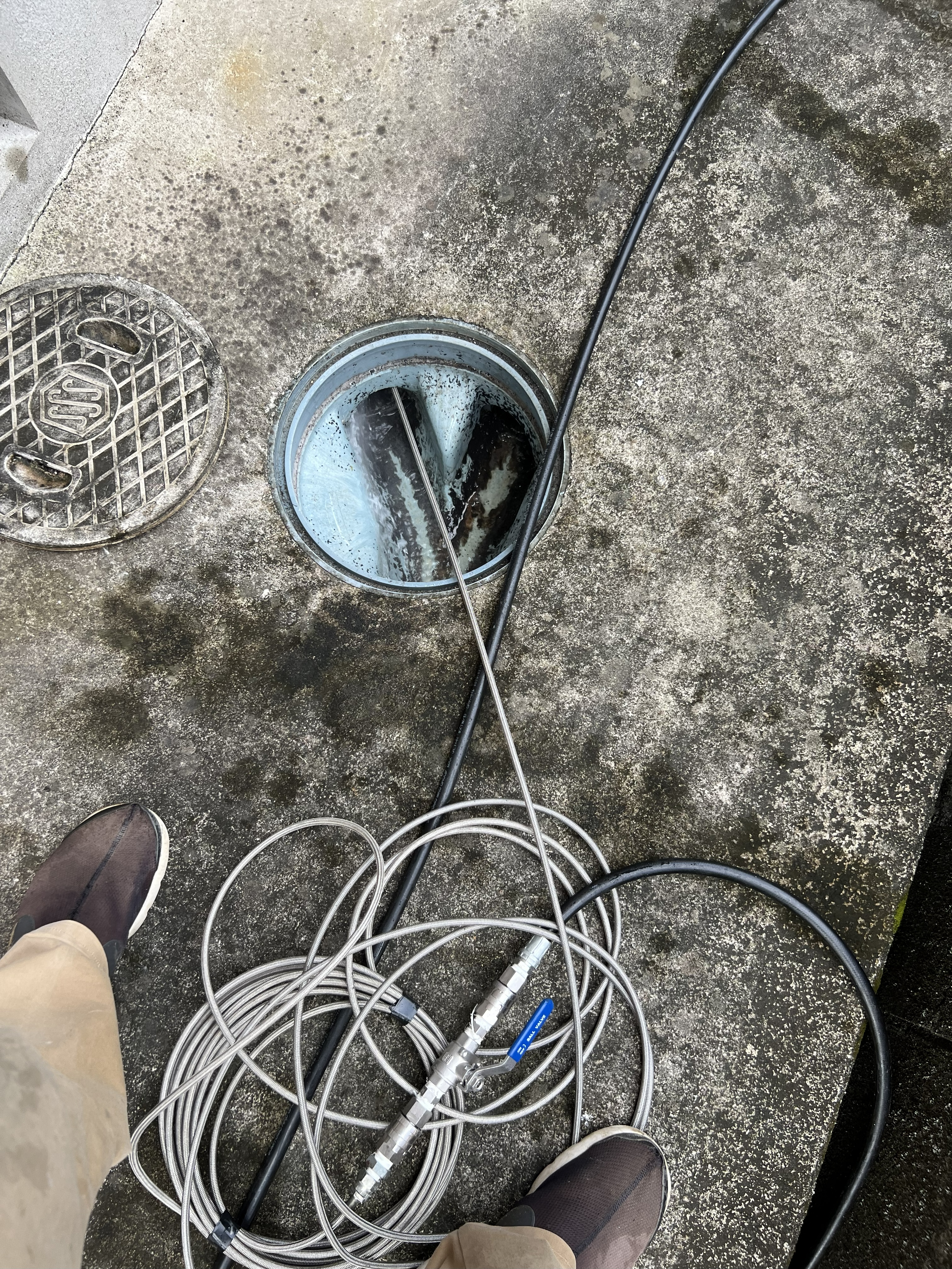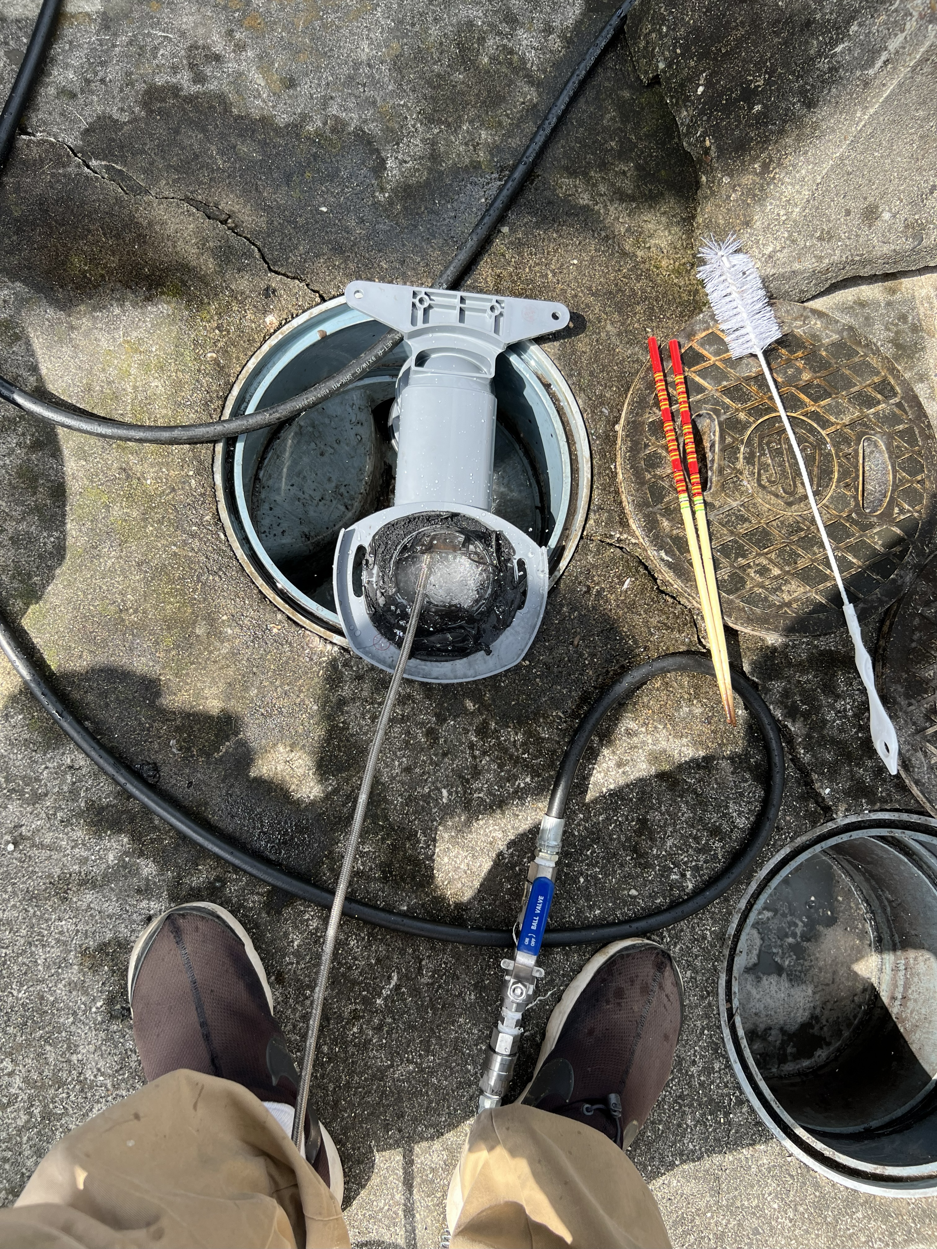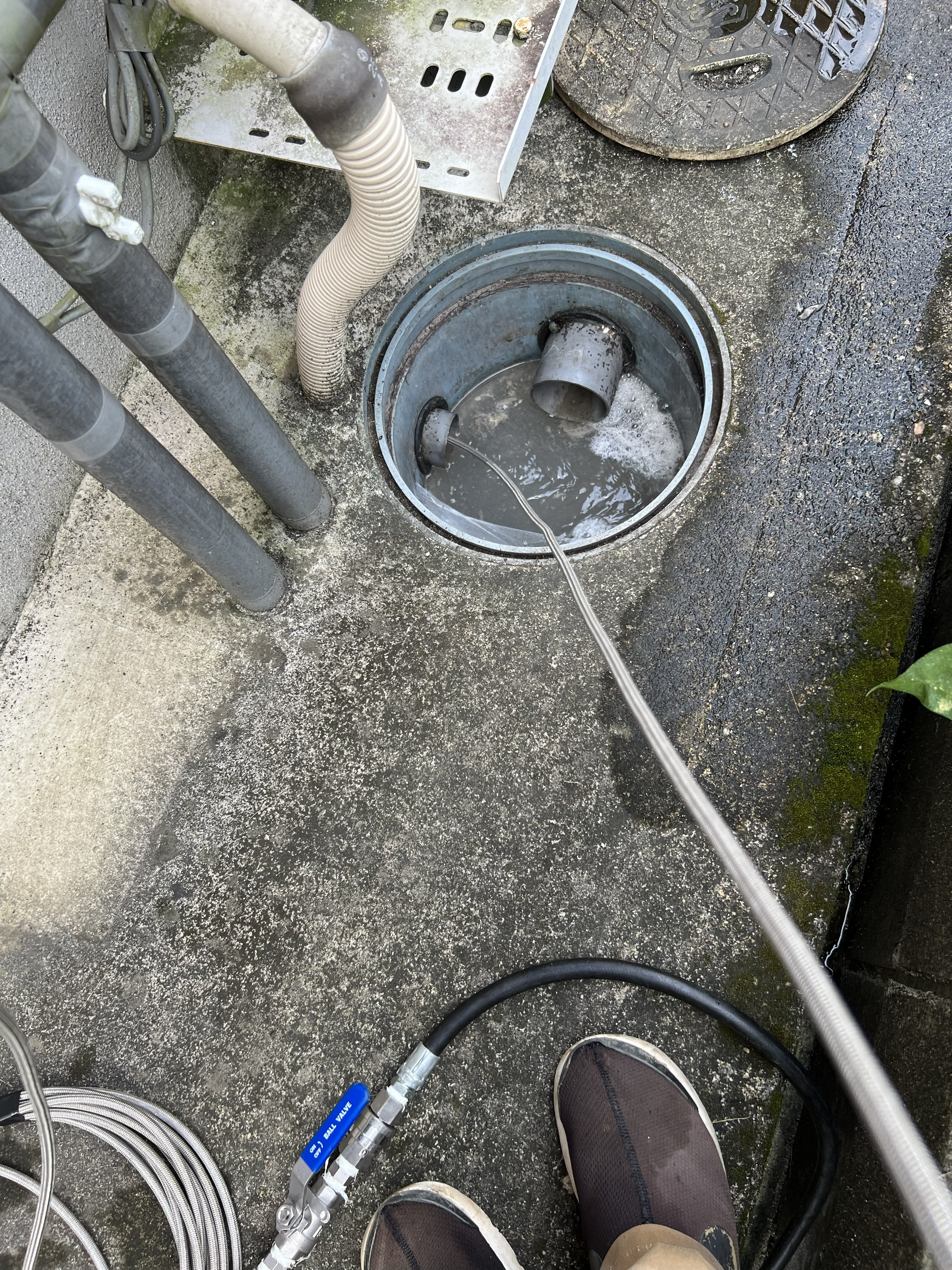 最後に外部の排水マスから各設備排水管内の洗浄を行い、排水マス内と外部の排