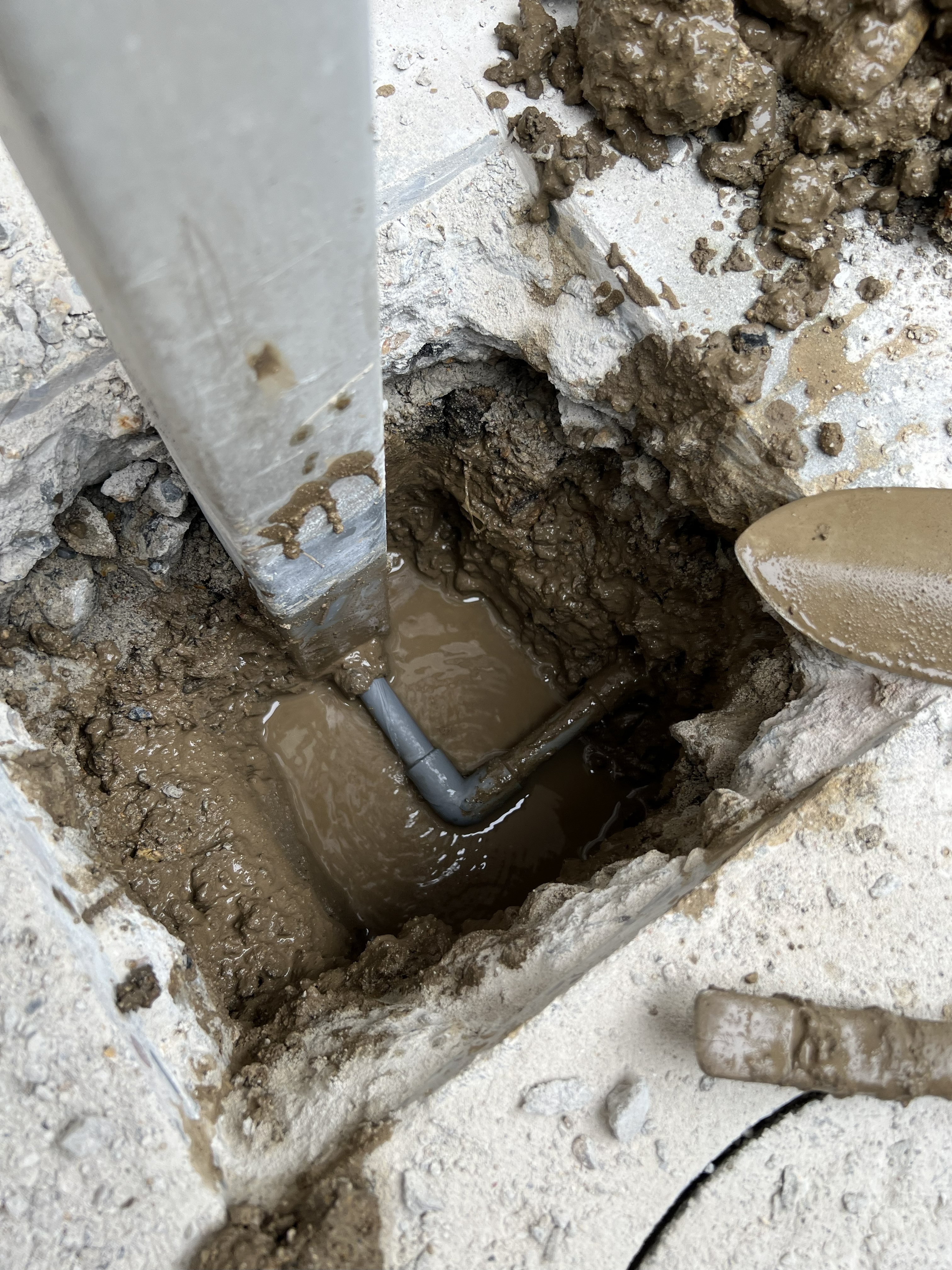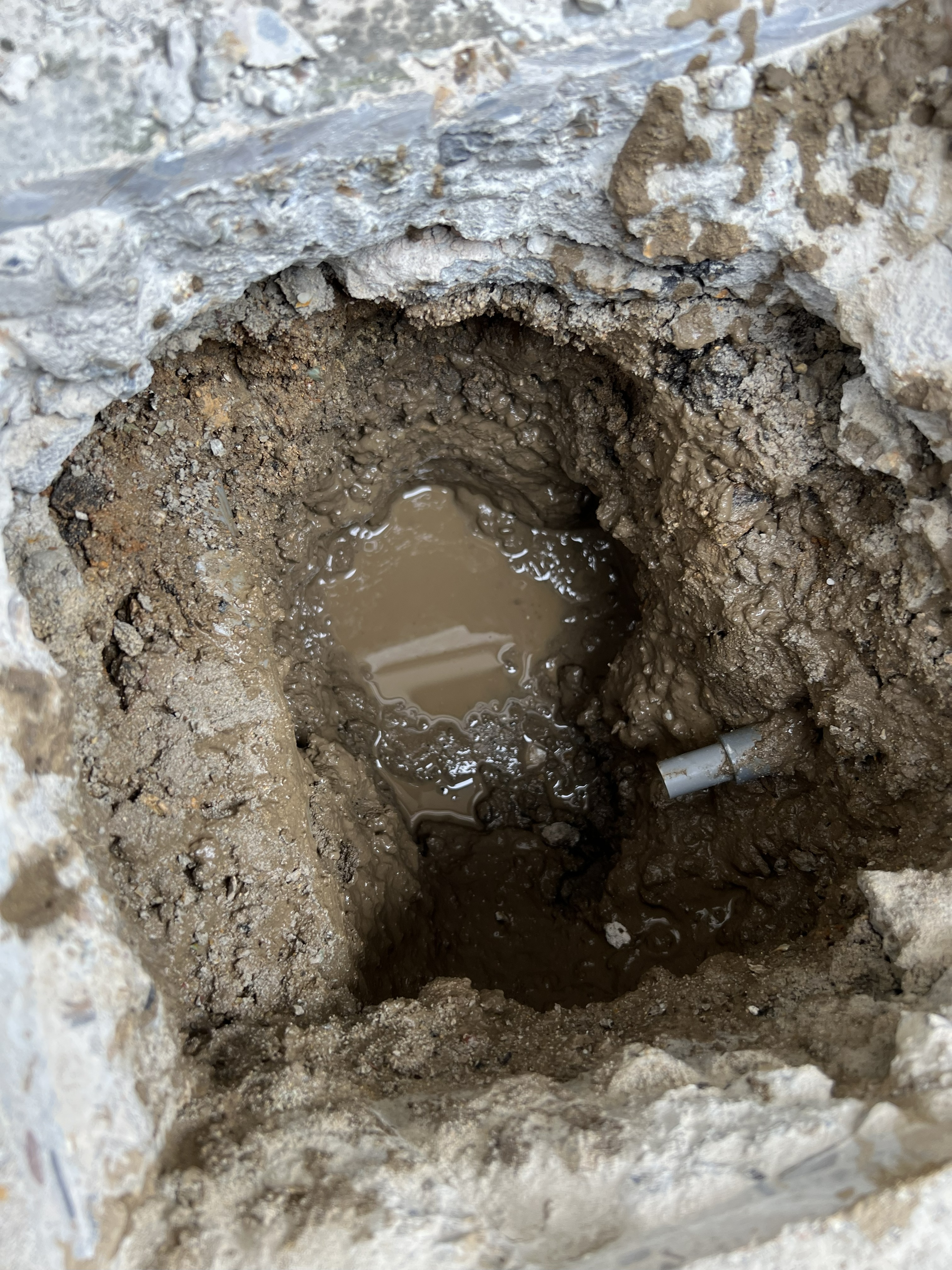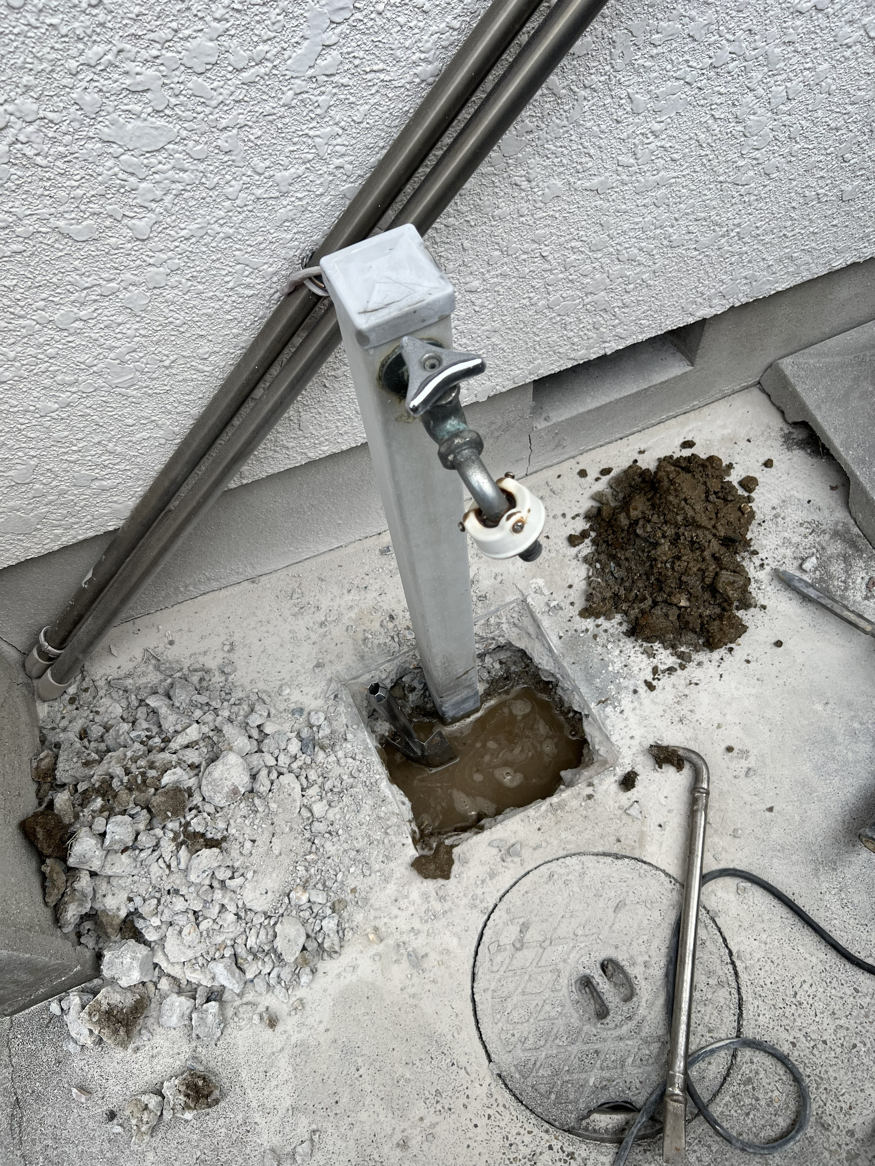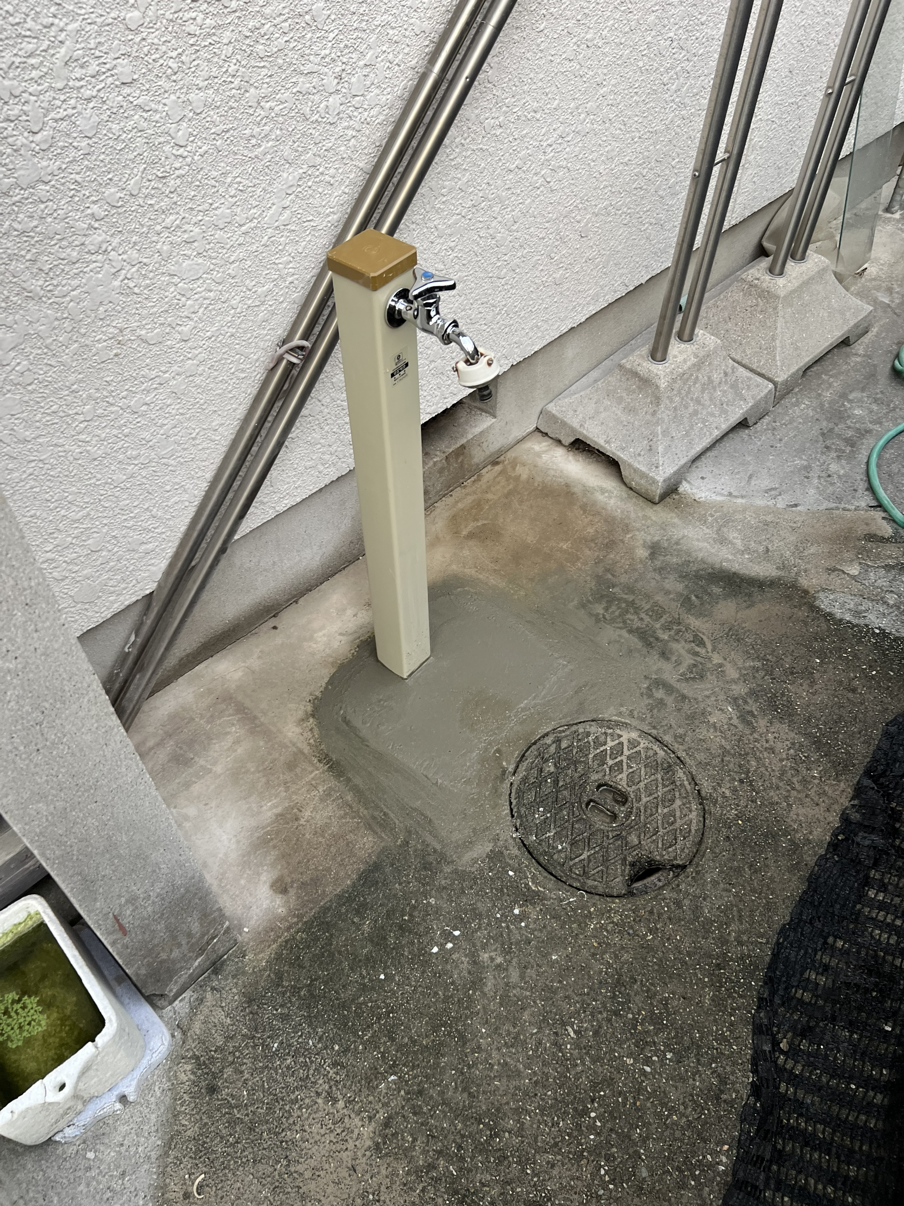 水栓柱の垂直を調整し土間コンクリートの復旧を行い漏水修理を完了しました。