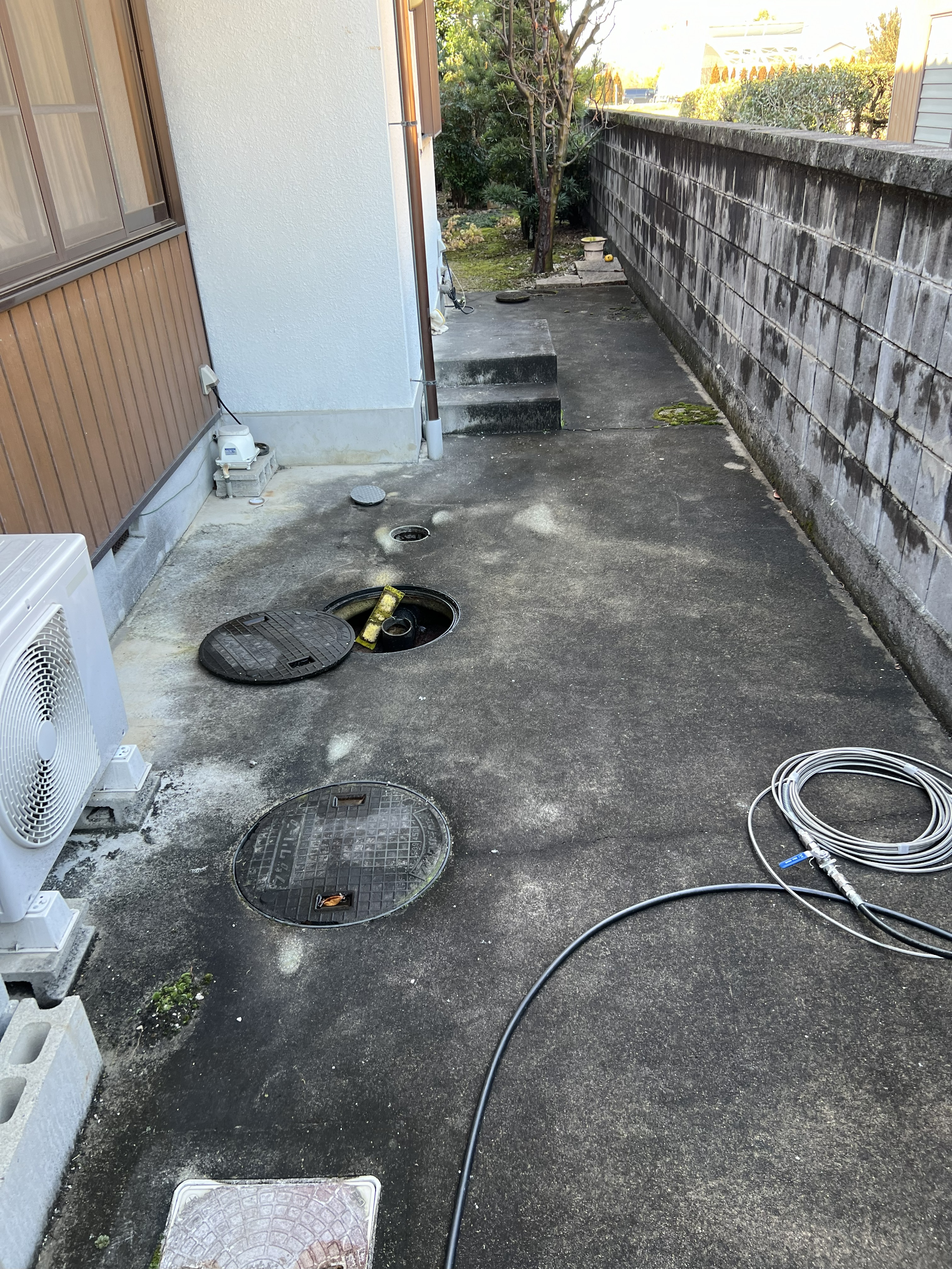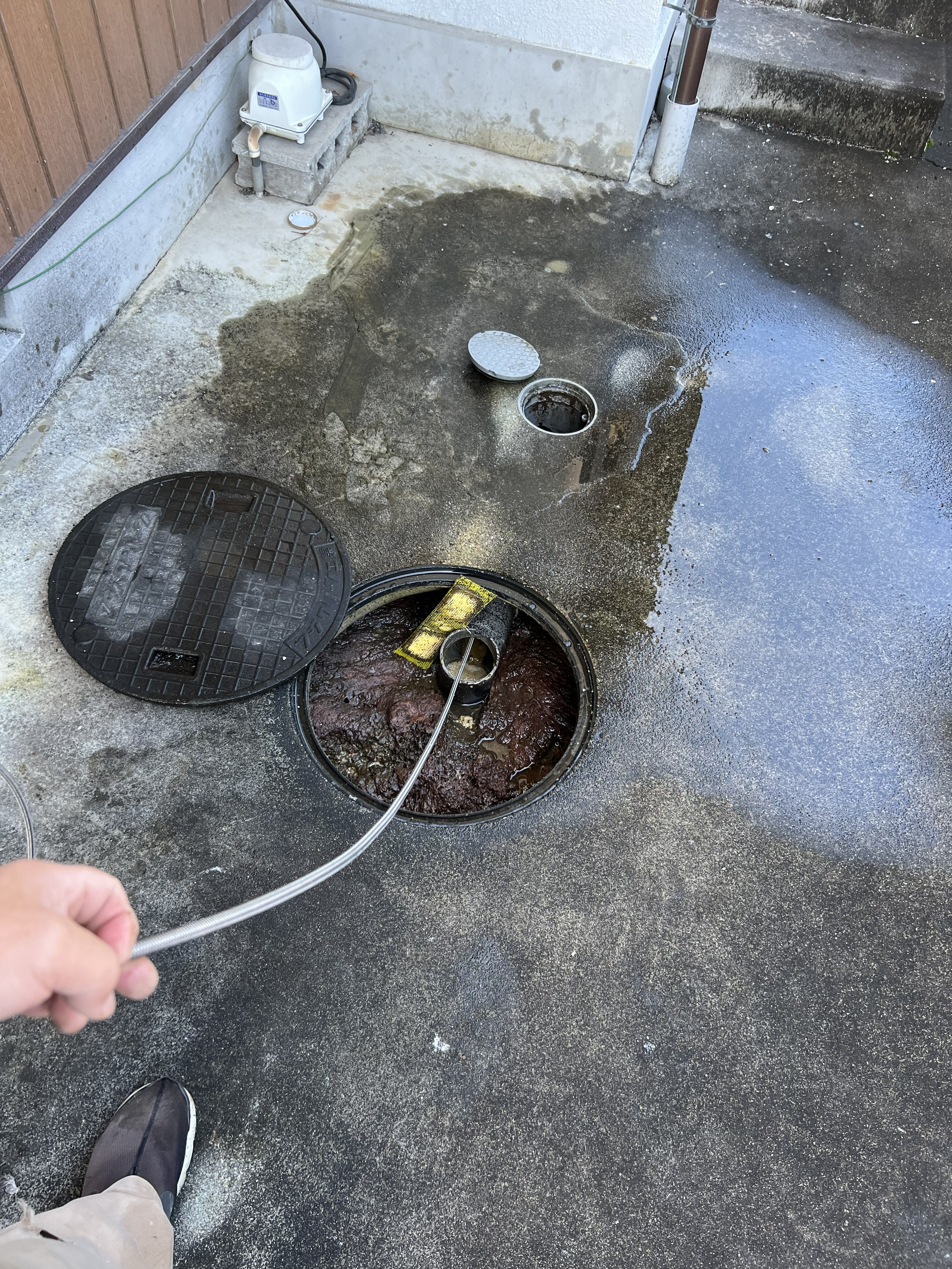 浄化槽の蓋を開けそこからトイレまでの排水管内を洗浄していきました。