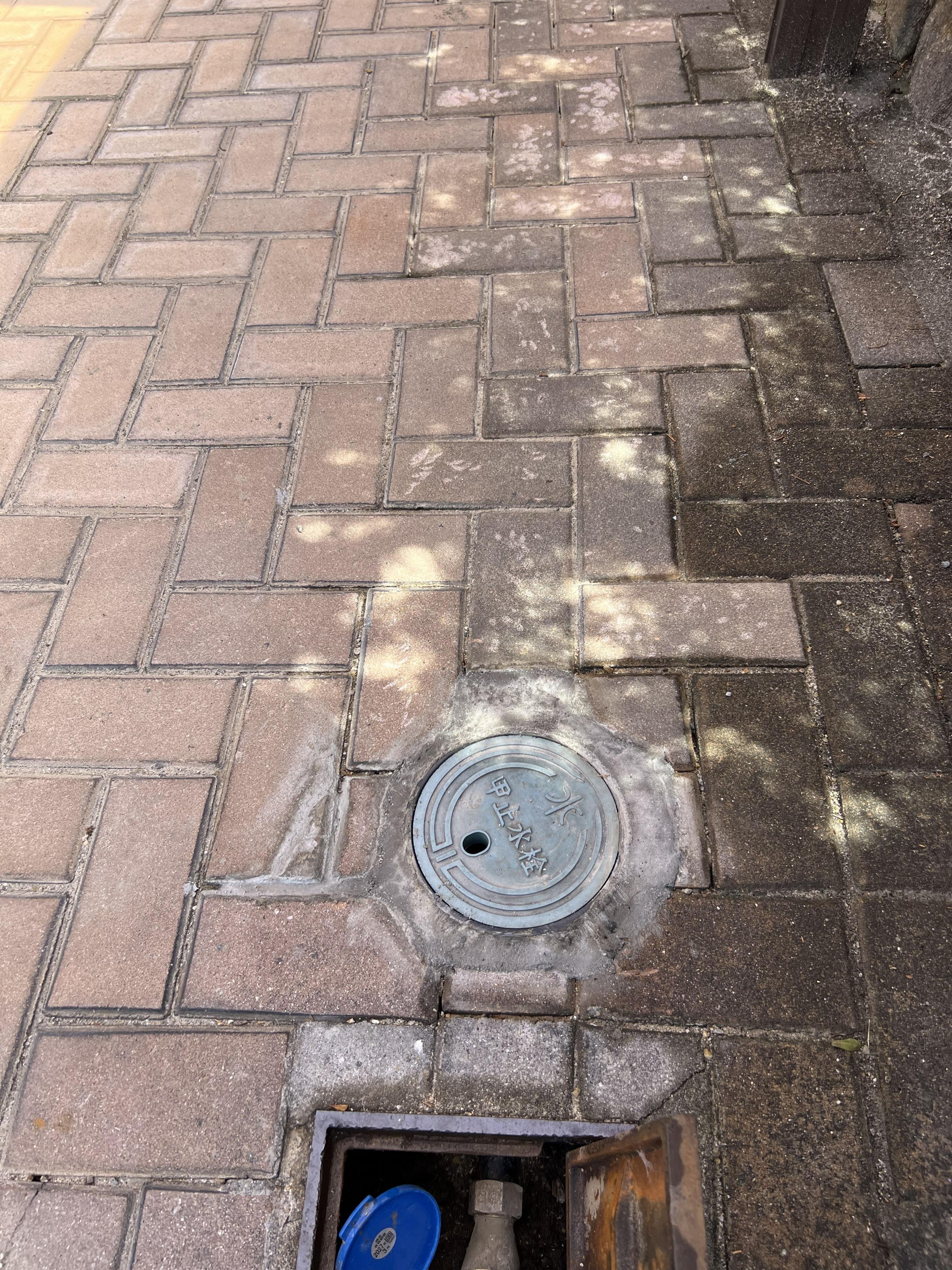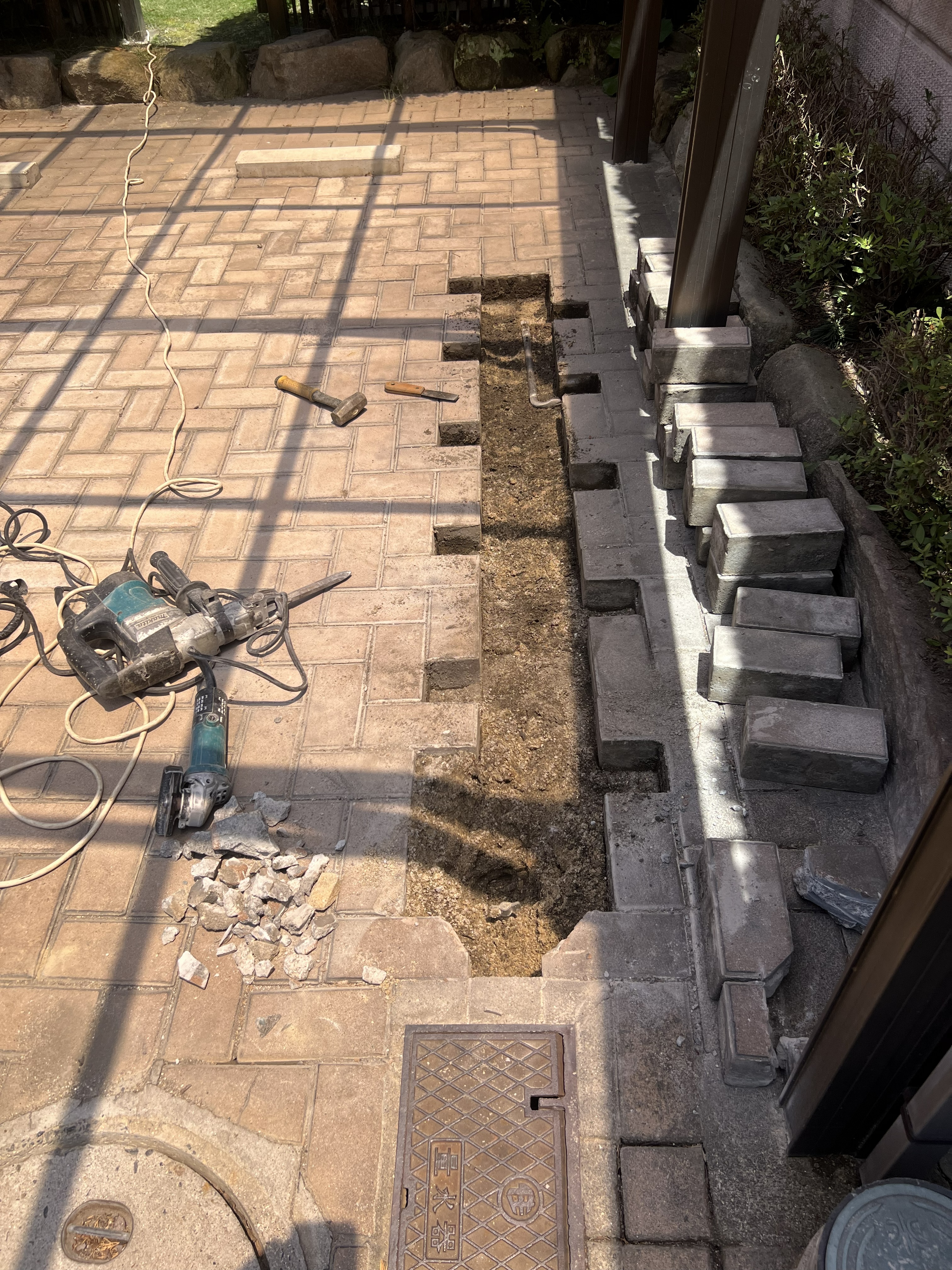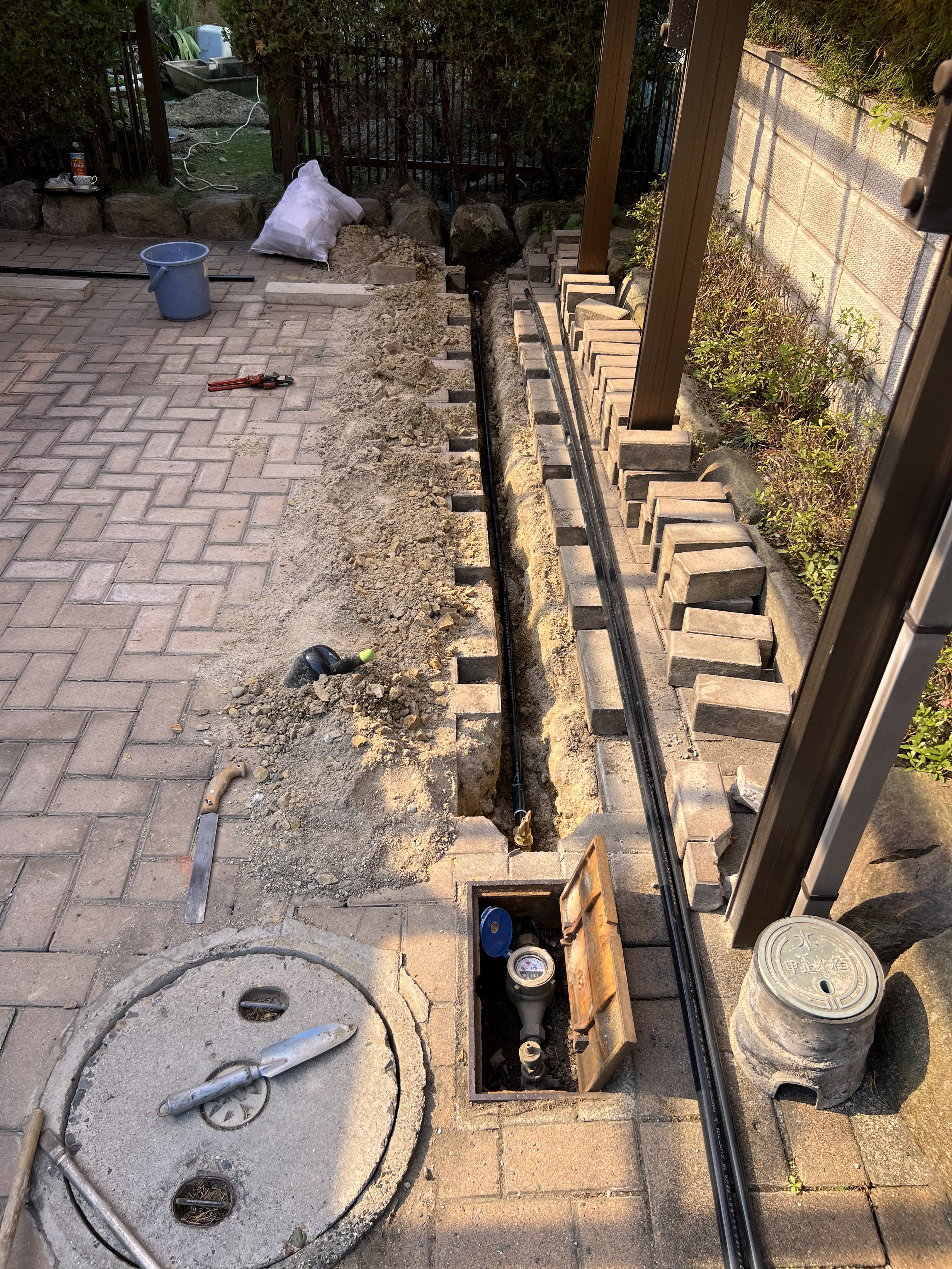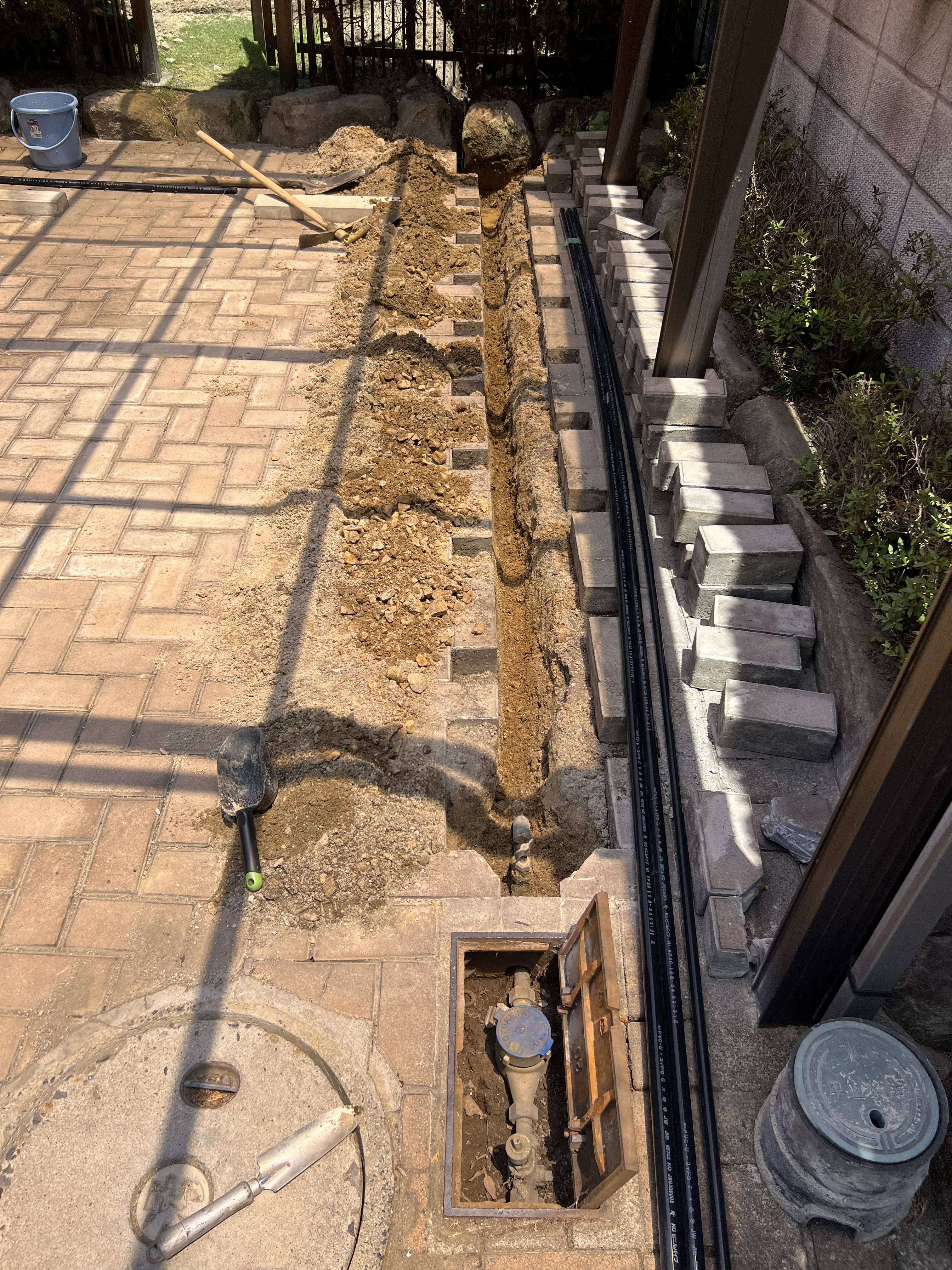駐車場はレンガが敷いてあるので水道メーターから新しくひき直す部分のレンガ