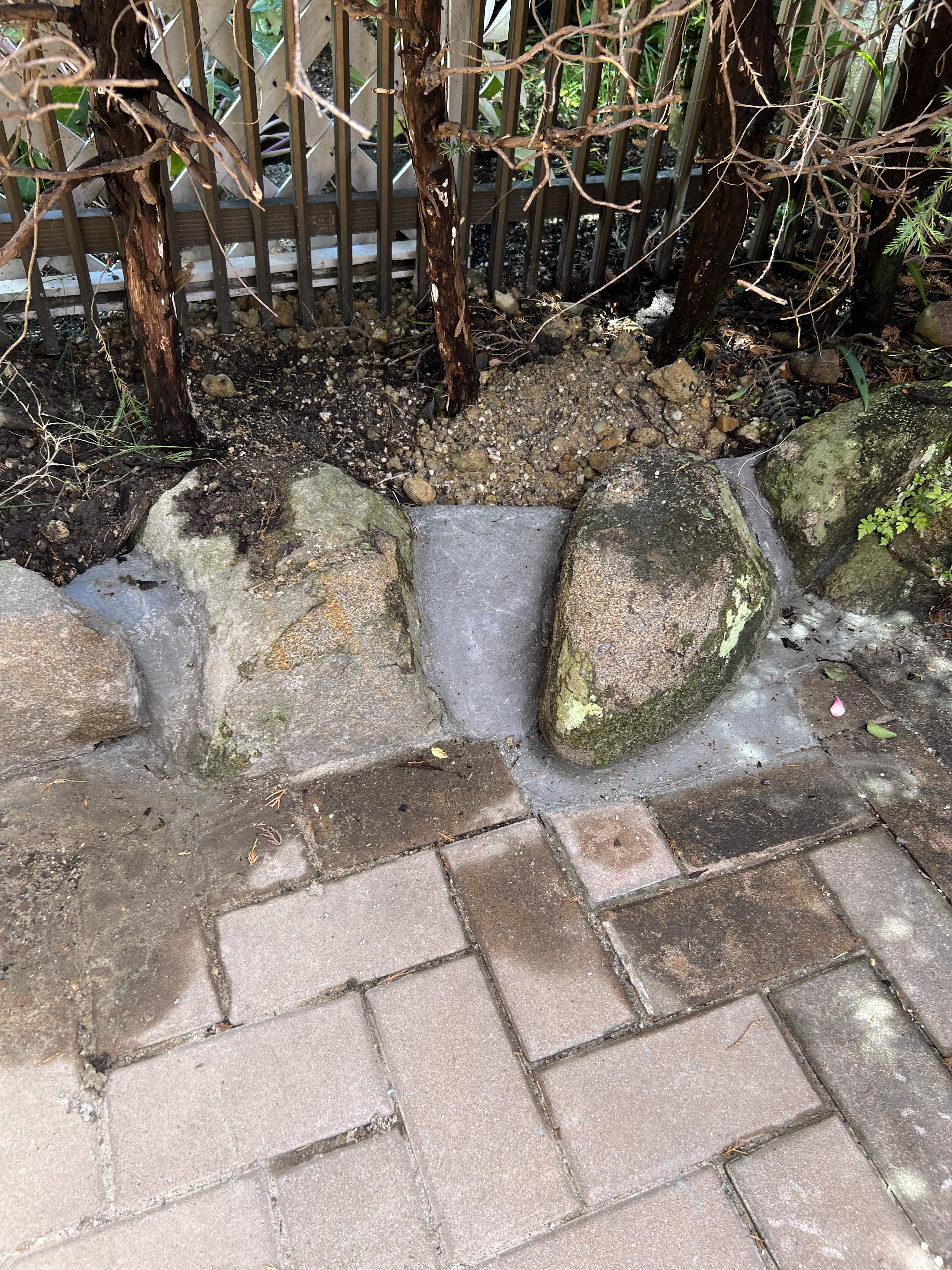 駐車場から庭の方へ抜けていくところに大きな岩が設置されて水道管が通すこと
